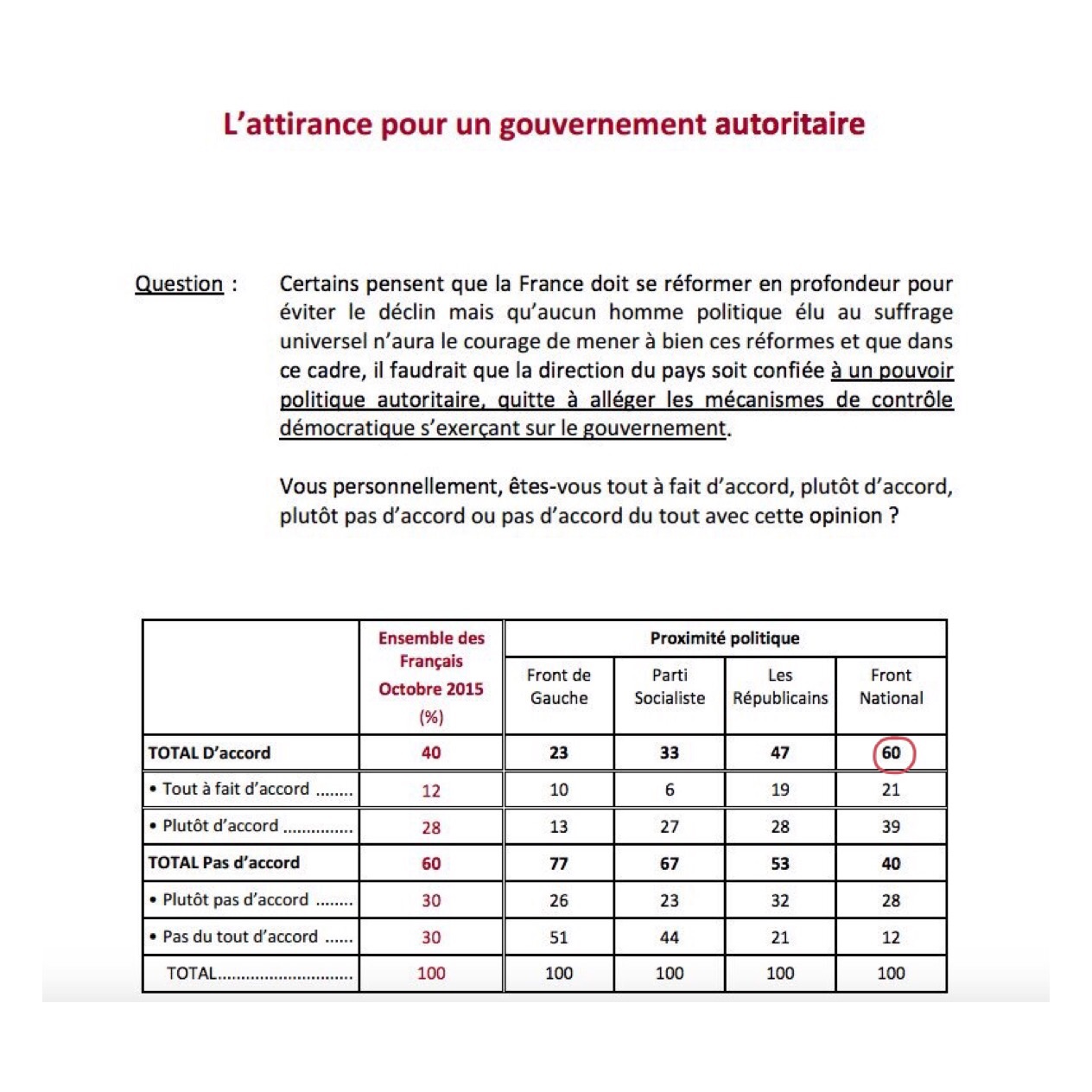 FDEBRANCHE Politiquefn 60 % des militants FN favorables à un gouvernement autoritaire 2 novembre 2015 Partager : Partager sur X(ouvre dans une nouvelle fenêtre) X Partager sur Facebook(ouvre dans une nouvelle fenêtre) Facebook Envoyer un lien par e-mail à un ami(ouvre dans une nouvelle fenêtre) E-mail J’aime chargement… Similaire
